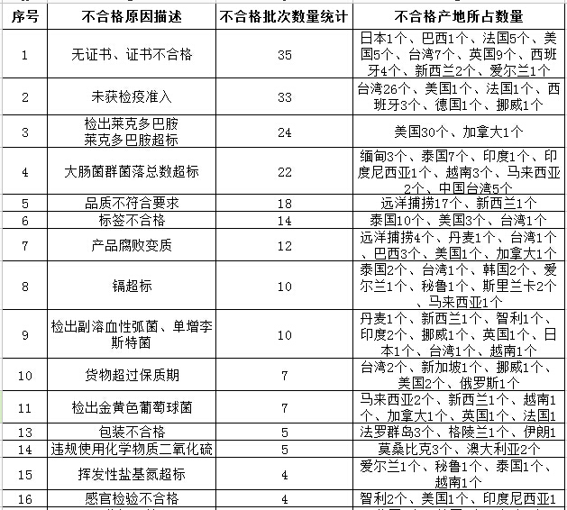 證書不合格、未獲檢疫準入、檢出萊克多巴胺和菌落總數(shù)超標為不合格主要原因。以上不合格產(chǎn)品均已依法做退貨、銷毀或改作他用處理,且未在國內(nèi)市場銷售。