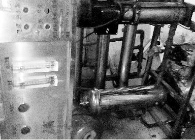 生產(chǎn)車間內(nèi)放置一個失修很長時間的過濾器和大水桶,空水桶被堆放在墻角。水龍頭旁邊就是塑封的機器,用于封口的桶蓋和塑封口上印有“樂百氏”、“娃哈哈”、“景田”等品牌商標(biāo)。
