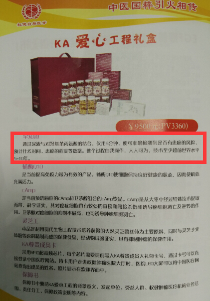 記者在該宣傳冊(cè)上看到,權(quán)健一款售價(jià)高達(dá)9500“KA愛心工程禮盒”系列產(chǎn)品宣稱:“通過尿液與對(duì)羥基苯丙氨酸的結(jié)合,僅用5分鐘,便可準(zhǔn)確檢測(cè)是否有患癌風(fēng)險(xiǎn),預(yù)計(jì)什么時(shí)間、患癌的程度等數(shù)據(jù),整個(gè)自我操作,人人可為,技術(shù)至少超前世界水平5到10年。”
