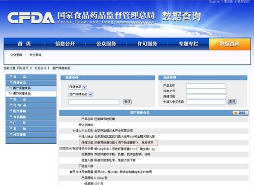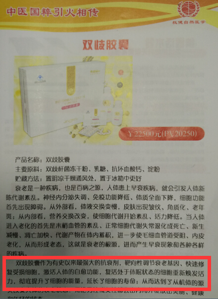 事實(shí)上,記者在權(quán)健宣傳資料上了解到,大部分產(chǎn)品都存在夸大功能、虛假宣傳的嫌疑,例如一款售價(jià)高達(dá)22500元的雙歧膠囊宣稱是有史以來最強(qiáng)大的抗衰老劑,靶向性調(diào)節(jié)衰老基因,延長細(xì)胞能量。而國家食品藥品監(jiān)督總局?jǐn)?shù)據(jù)查詢中心顯示,其批準(zhǔn)功效僅僅是改善胃腸道功能(調(diào)節(jié)腸道菌群)、免疫調(diào)節(jié)。