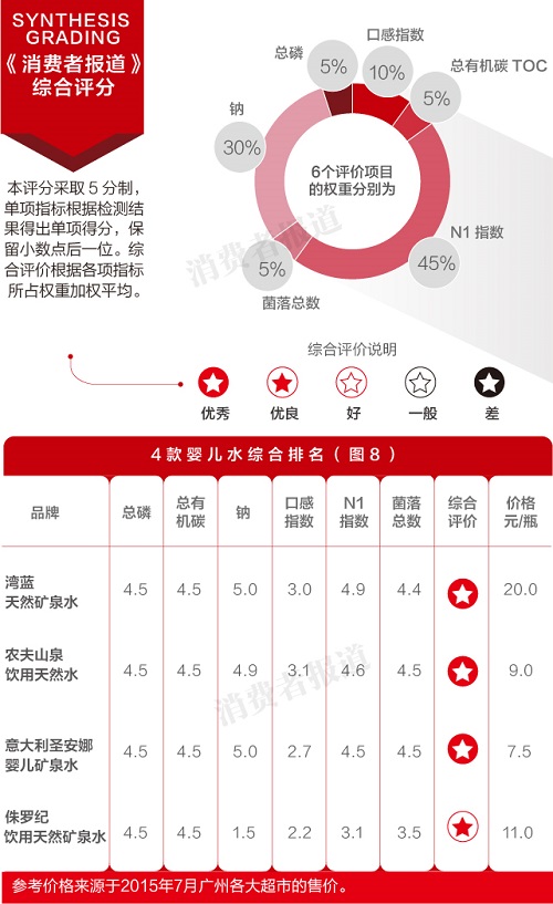通過綜合比較N1指數(shù)、總有機(jī)碳TOC、總磷、鈉、口感指數(shù)、菌落總數(shù)等指標(biāo),礦泉水、天然水中達(dá)能益力、景田百歲山性能強(qiáng)悍,而在嬰幼兒飲用水中侏羅紀(jì)性能低于其它三款,本刊建議消費(fèi)者慎重選購(gòu)。