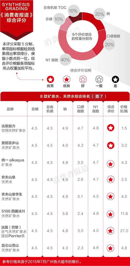 2015年7月,《消費(fèi)者報(bào)道》送檢了10品牌10款天然礦泉水和2款天然水,包括農(nóng)夫山泉、昆侖山、5100、景田百歲山、統(tǒng)一alkaqua、法國(guó)perrier、達(dá)能益力等7款天然礦泉水,以及農(nóng)夫山泉、侏羅紀(jì)、灣藍(lán)、圣安娜等4款嬰幼兒水,還有一款農(nóng)夫山泉天然水。