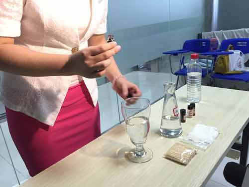 往酒杯里倒入一定量的純凈水,接著倒入食用酒精,再分別加入一定量的四種食品添加劑,慢慢調制出紅酒的誘人顏色和香味。記者喝了一口,這勾兌出的紅色液體和紅酒的味道確實非常接近。