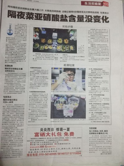 檢測結果:六組對照試驗均無明顯變化,隔夜菜的亞硝酸鹽含量比新炒菜沒有顯著增高,可以食用。北京智云達提醒消費者剩菜最好保存在冰箱等低溫環境下,不易變質,但也不宜超過兩天,并且不要長時間放置在室溫環境下,細菌容易滋生,會將硝酸鹽轉化成亞硝酸鹽。