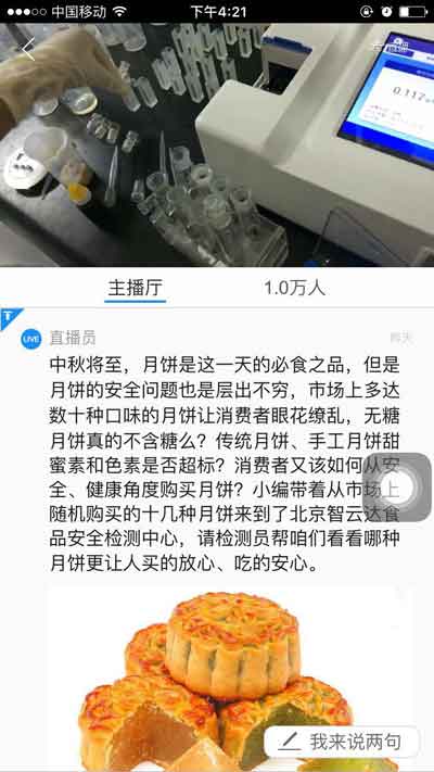 2016年9月14日14:00,北京智云達科技股份有限公司(以下簡稱“北京智云達”)與騰訊大燕網(wǎng)直播月餅中甜蜜素的檢測。