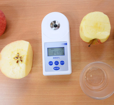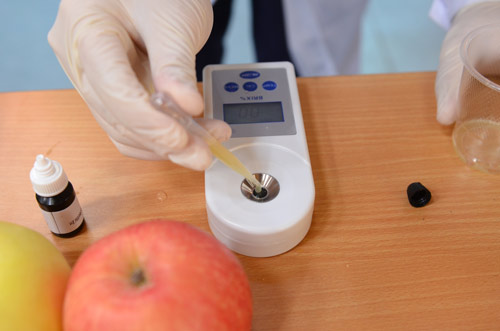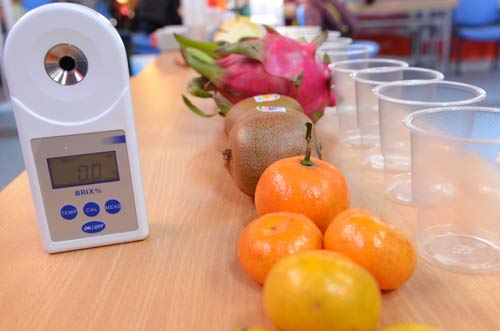 北京智云達(dá)技術(shù)工程師楊老師和王老師首先將水果去皮榨汁,不加水,再通過(guò)使用北京智云達(dá)自主研發(fā)生產(chǎn)的快速檢測(cè)產(chǎn)品:數(shù)顯糖度儀,對(duì)樣品溶液的糖度進(jìn)行檢測(cè)。