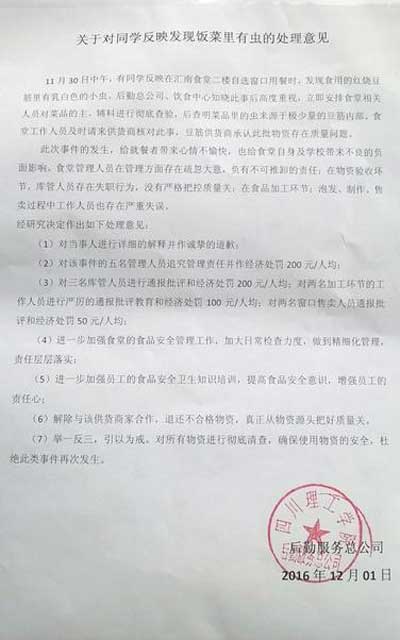 12月1日,四川理工學院后勤服務總公司在食堂周邊粘貼了一份《處理意見》,稱已經查明該乳白色小蟲來自存在質量問題的豆筋內部,對涉及該事件的12名責任人進行通報批評和50-200元不等的經濟處罰,并與該供貨商解除合作。