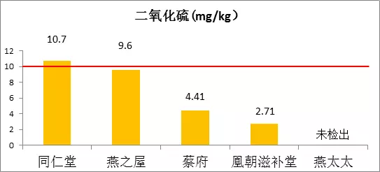 五品牌燕窩中,同仁堂燕窩二氧化硫殘留最高,為10.7mg/kg;燕太太燕窩未檢出。