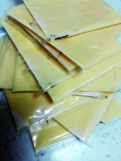 “正月初三的時候,我在超市內購買三元芝士片,正好趕上超市有活動,買兩袋贈送了一袋。”果女士稱,將商品拿回家之后,她就將芝士片放在了冰箱里,一直沒有拿出來。“冰箱一直沒有斷電,都是正常制冷的。”她稱,直到昨天,她從冰箱內將芝士片拿出來準備食用,卻發現一個袋子中的芝士片已經發霉了。“發霉的芝士片是贈送的那一袋,里面的每一片都有一片綠色霉點。其他兩袋是正常的,沒有壞。我觀察霉變的芝士片上都有一道黑線,黑線的一側都有霉菌,要是我不小心吃到肚子里,肯定是要鬧肚子的。”