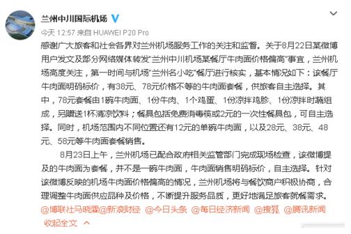 8月23日上午,蘭州機(jī)場(chǎng)已配合政府相關(guān)監(jiān)管部門(mén)完成現(xiàn)場(chǎng)檢查,該微博提及的牛肉面為套餐,并不是一碗牛肉面,牛肉面銷(xiāo)售明碼標(biāo)價(jià),自主選擇。針對(duì)該微博反映的機(jī)場(chǎng)牛肉面價(jià)格偏高的情況,蘭州機(jī)場(chǎng)將與餐飲商戶(hù)積極協(xié)商,合理調(diào)整牛肉面供應(yīng)品種及價(jià)格,不斷提升服務(wù)品質(zhì),更好地滿(mǎn)足旅客就餐需求。