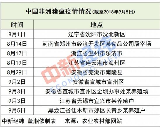 9月5日,農業農村部接到中國動物疫病預防控制中心報告,經中國動物衛生與流行病學中心(國家外來動物疫病研究中心)確診,黑龍江省佳木斯市郊區長青鄉某養殖戶發生非洲豬瘟疫情,該養殖戶存欄生豬87頭,發病39頭,死亡12頭。